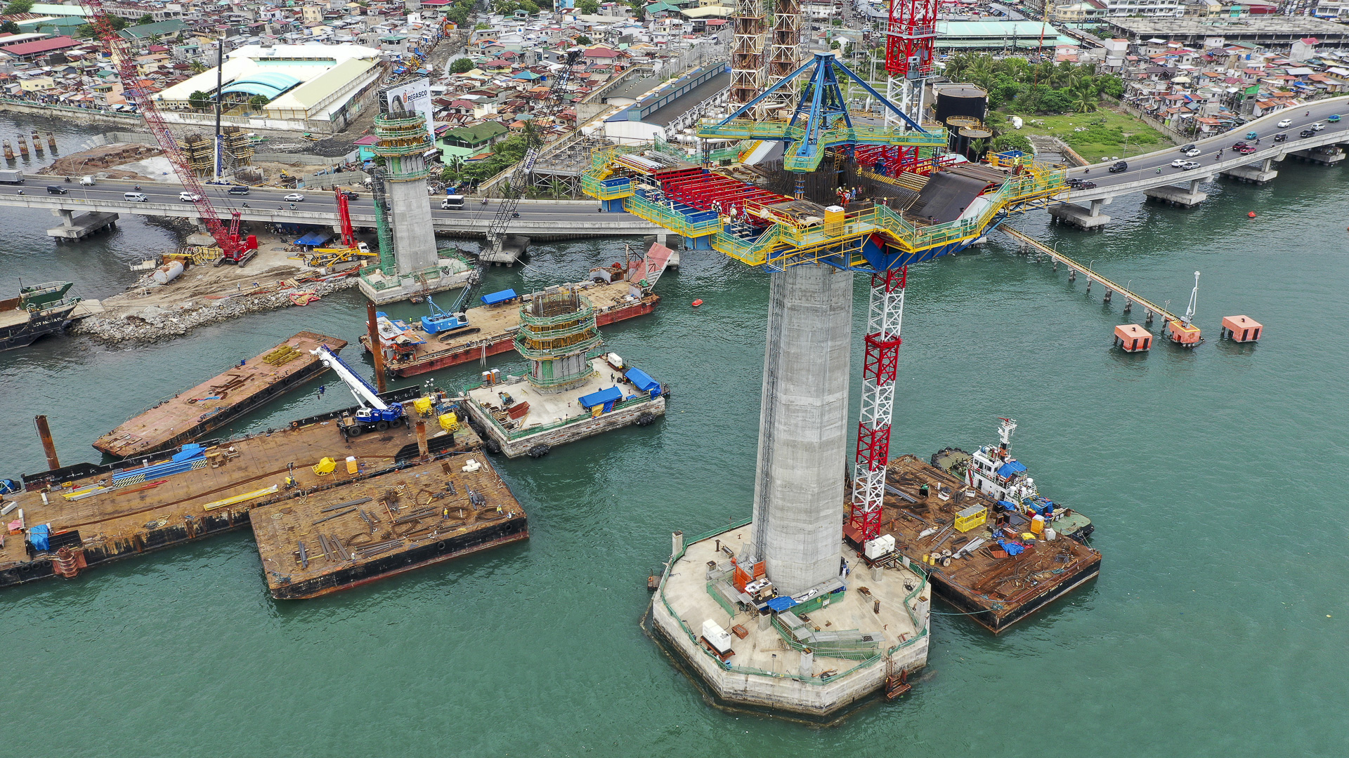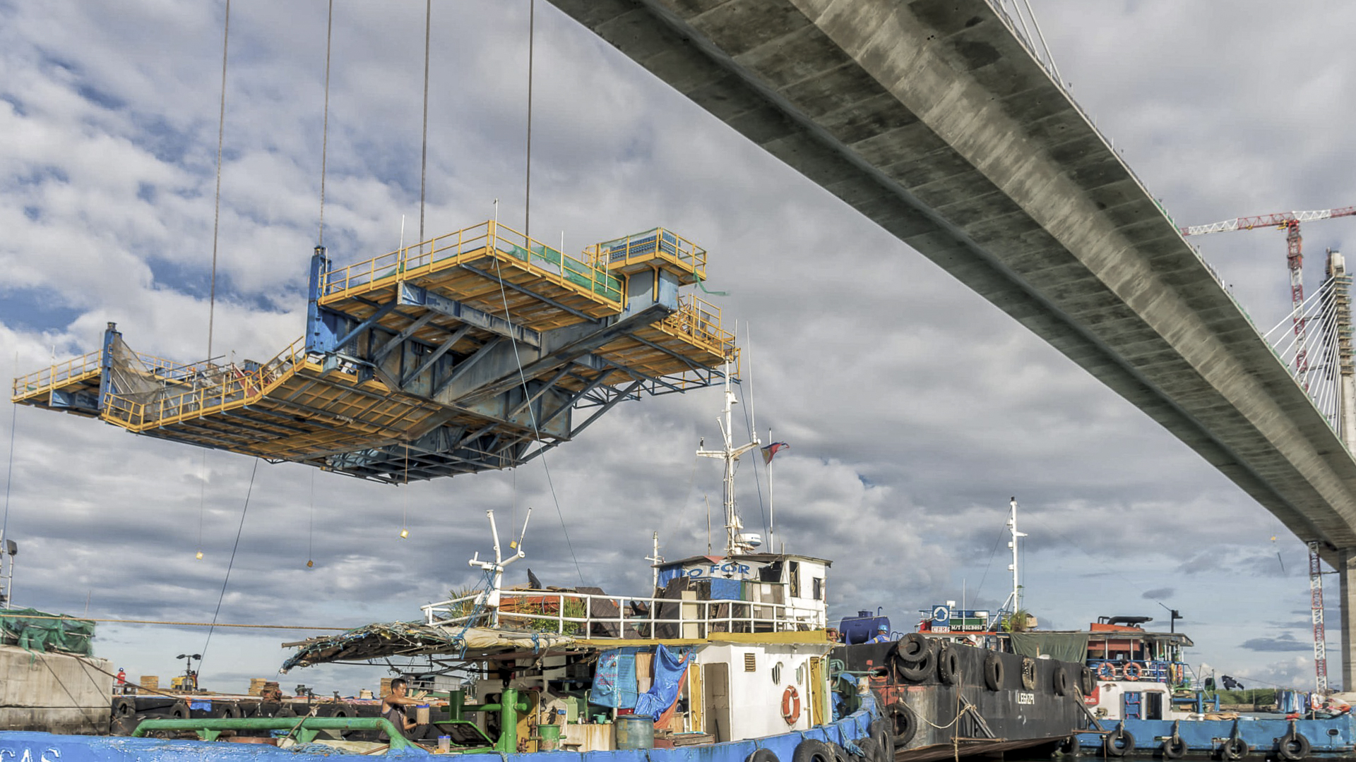 Tensioning is provided by 17 pairs of stay cables from the caisson axis to vertical towers 140 m in total height, 91 m above the deck. The section of the tower is octagonal with variable dimensions in both elevations. On the upper part, metal plates are added externally to draw the geometry of a 40 m cross on each side of the tower, an ornamental element foreseen in the basic solution to pay homage to the importance of Cebu as the first place of presence of the Catholic Church in the islands.