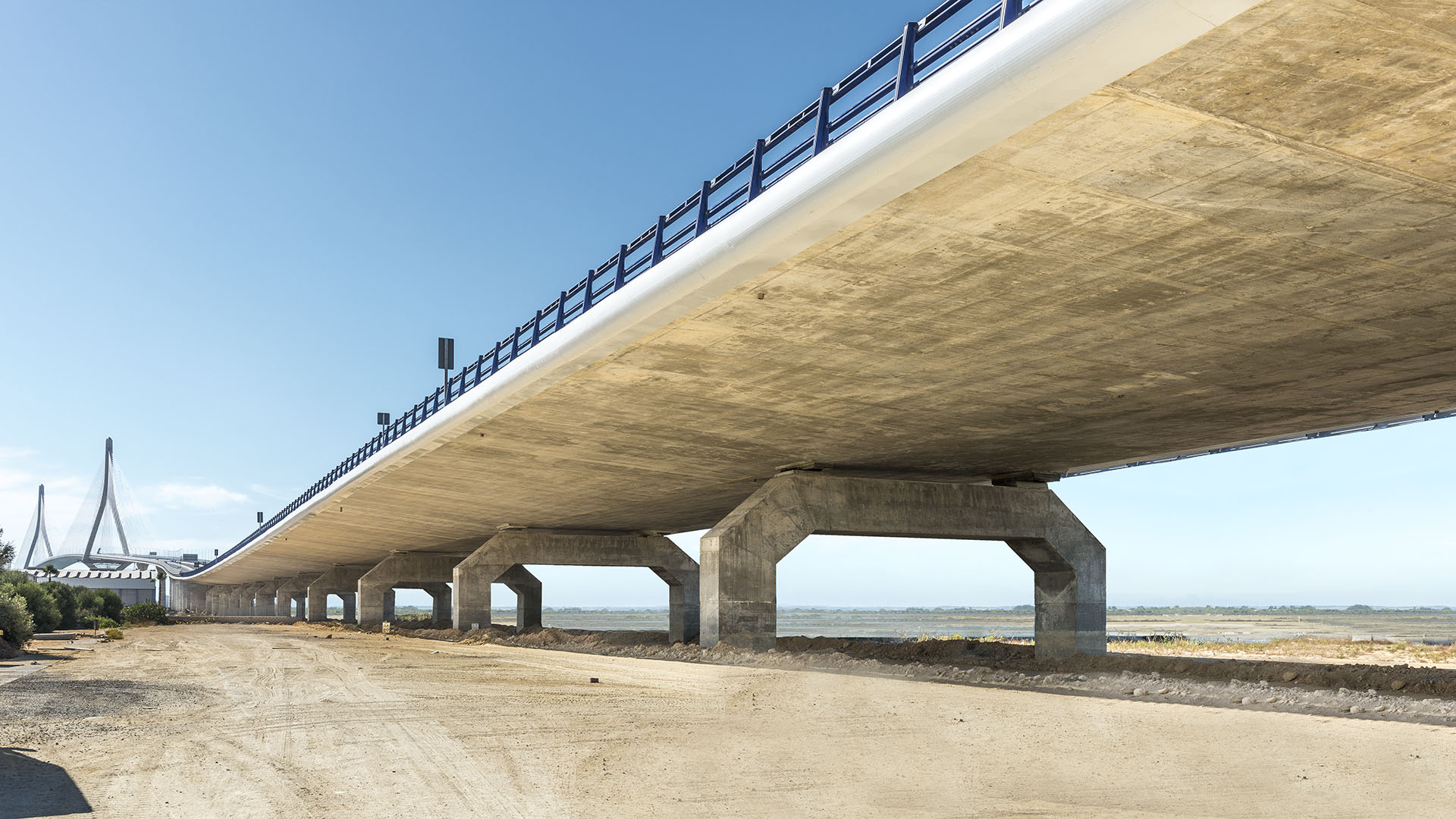 El Puente sobre la Bahía de Cádiz tiene una longitud total de 3092 m y cruza la bahía desde la ciudad de Cádiz hasta Puertorreal. El puente principal es un puente atirantado con una luz principal de 540 m, vanos de compensación de 200 m y un gálibo de navegación de 69 m.