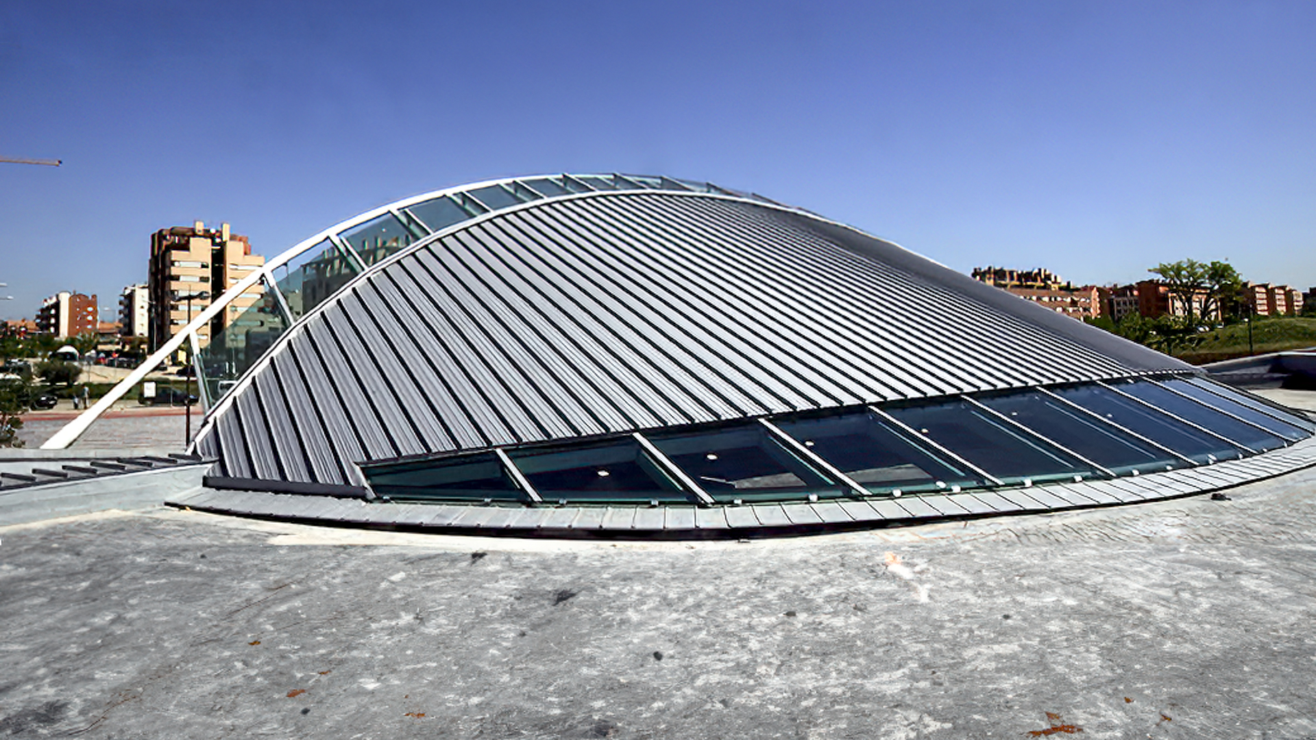 La estructura está revestida superiormente con chapa de aluminio nervada del tipo «Kalzip» excepto en una franja inferior acristalada que permite la entrada de luz directa al vestíbulo de acceso. Interiormente se reviste con lamas de aluminio blancas.
