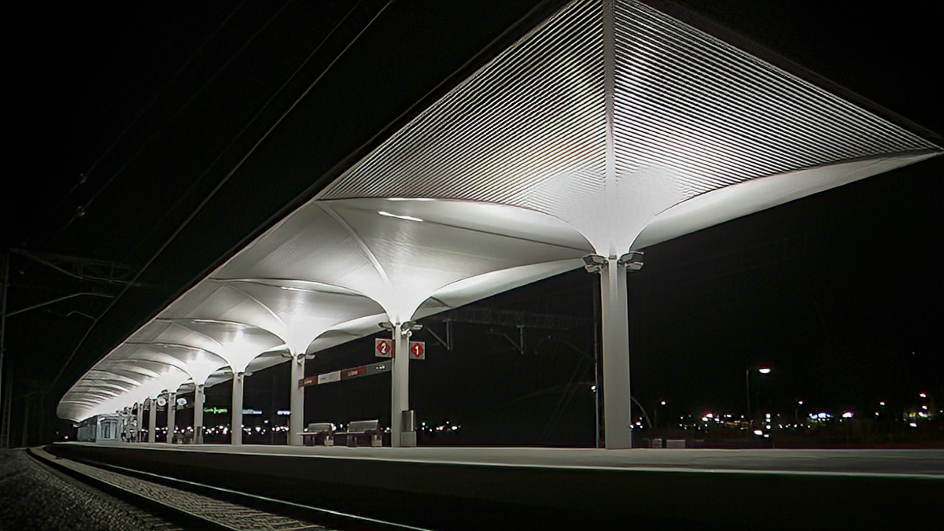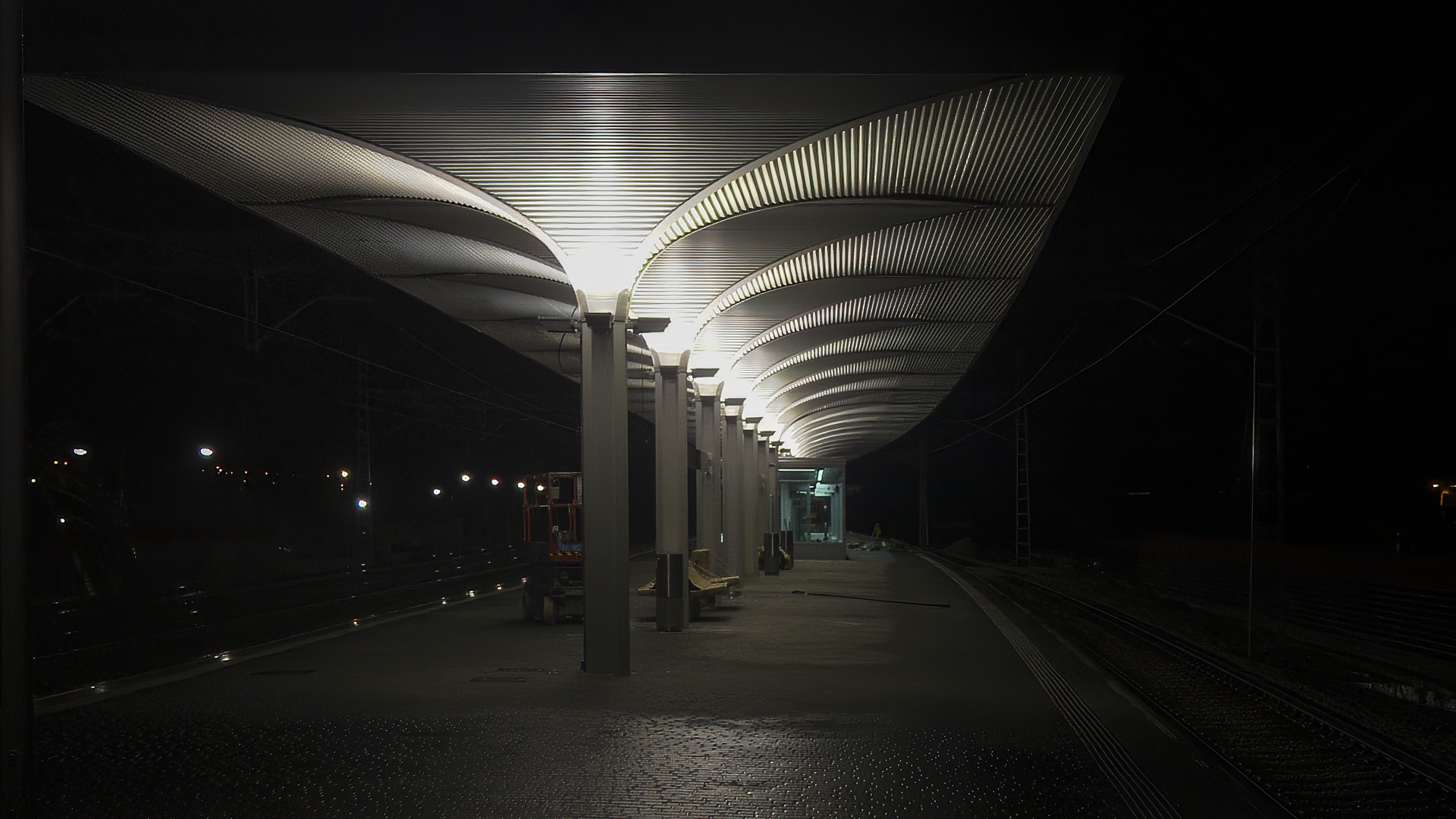 Los primeros sirven de apoyo al tramex de cierre. De los dos se cuelga una pasarela curva en planta de la que se cuelgan a su vez las puertas abatibles que delimitan el acceso a la estación.
