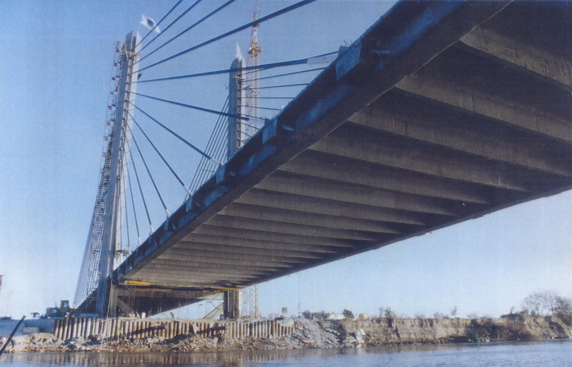 El puente se construyó por voladizos sucesivos atirantados, hormigonados mediante carros, avanzando simétricamente desde las torres hacia el centro del vano principal y hacia los estribos.