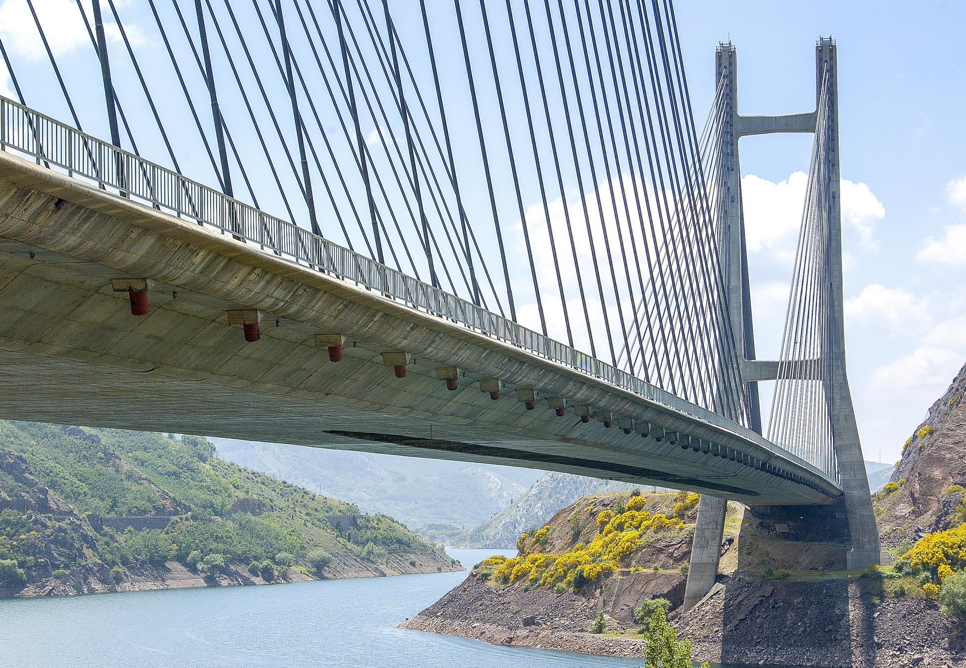 Los tirantes se disponen a una separación de 8,04 m a lo largo del dintel y lo cuelga en toda su longitud, incluso en la zona de pila, donde el dintel se apoya solo horizontalmente.