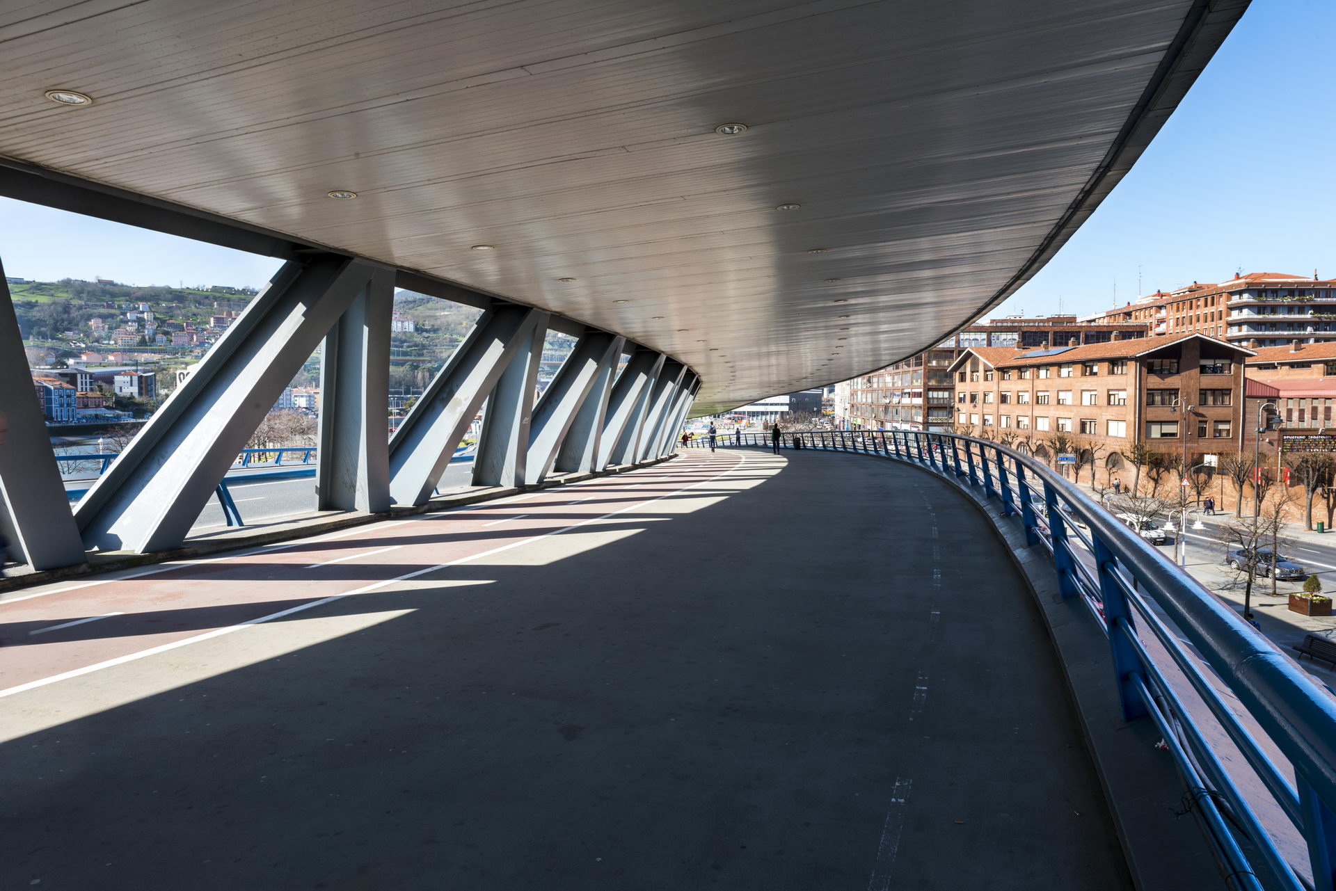 1º) Las bases del concurso proponían dos aceras de 5,00 m de anchura y nosotros propusimos y obtuvimos el permiso para juntarlas en una sola acera de 10m de anchura, además cubierta, pues Bilbao es una ciudad extraordinariamente lluviosa.