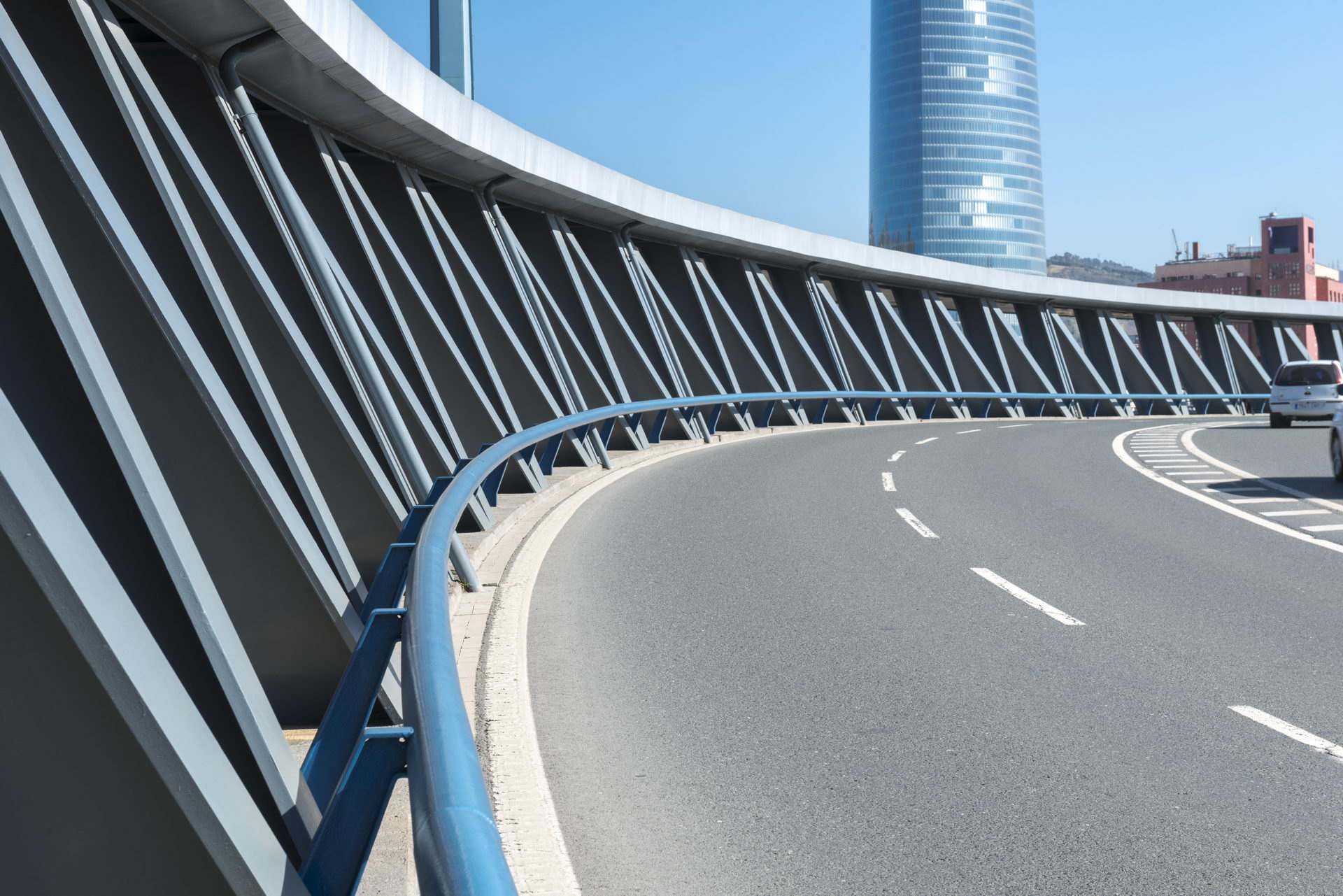 2º) La estructura principal está constituida por una viga en forma de “Z”. El elemento vertical (algo inclinado en este caso), es una celosía metálica, que realiza un doble papel, el de alma de una gran viga en “Z” y de separación visual entre el tráfico peatonal y el viario. La parte horizontal inferior de la “Z” está constituida por el tablero situado bajo los carriles de rodadura que es una viga cajón de 1,95 m de canto y 10m de ancho que se prolonga con costillas metálicas de 10,5 m de voladizo hacia la acera de peatones y de 6,5 m hacia el lado del tráfico. La parte superior de la viga en “Z” la forma la celosía horizontal que constituye la cubrición del paso de peatones.