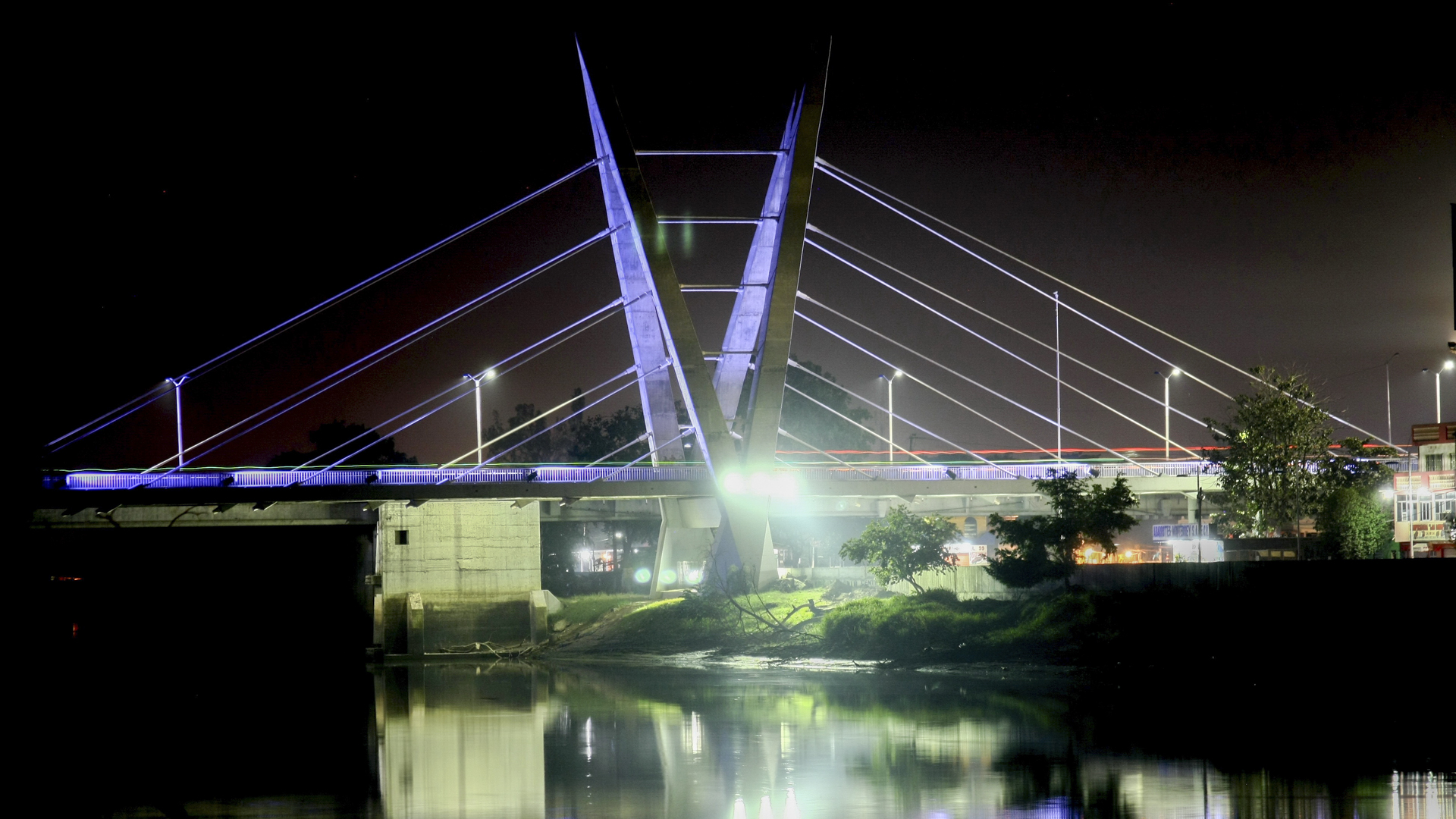La luz relativamente pequeña de este puente entre los atirantados, nos ha llevado a plantear una solución singular, dando máximo protagonismo a las torres con una configuración espacial, porque se abren en V en el alzado del puente, y se cierran en A en el plano transversal.