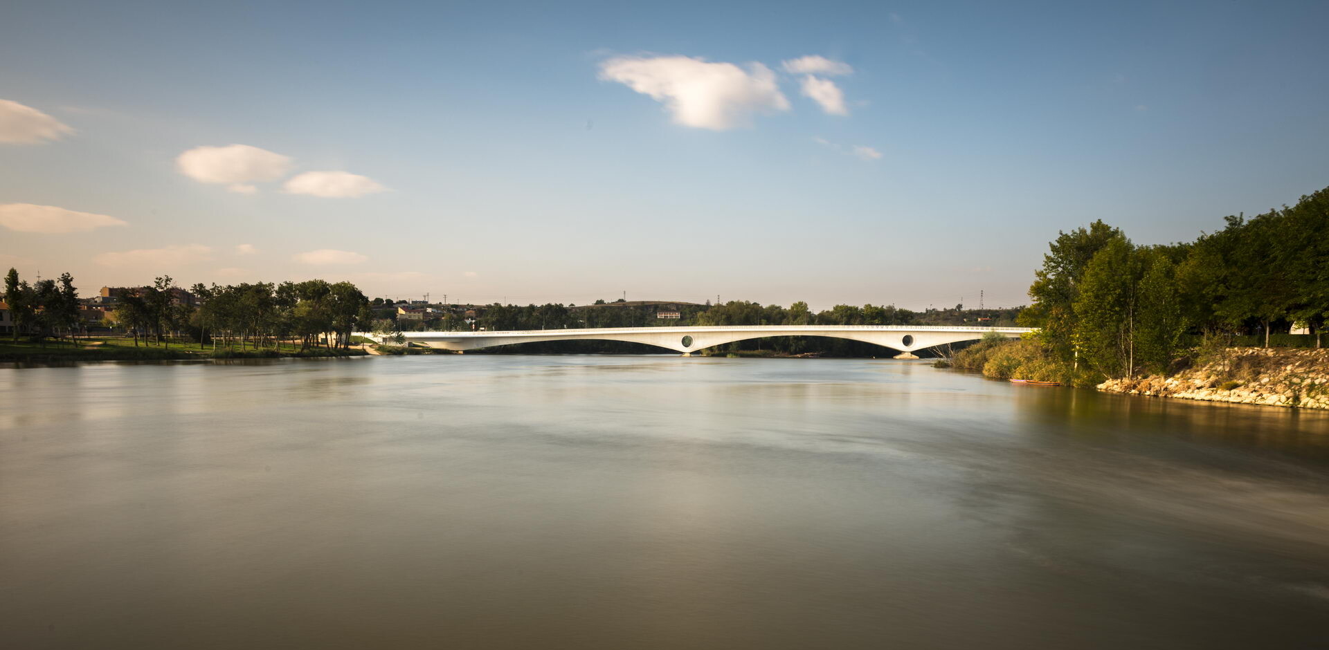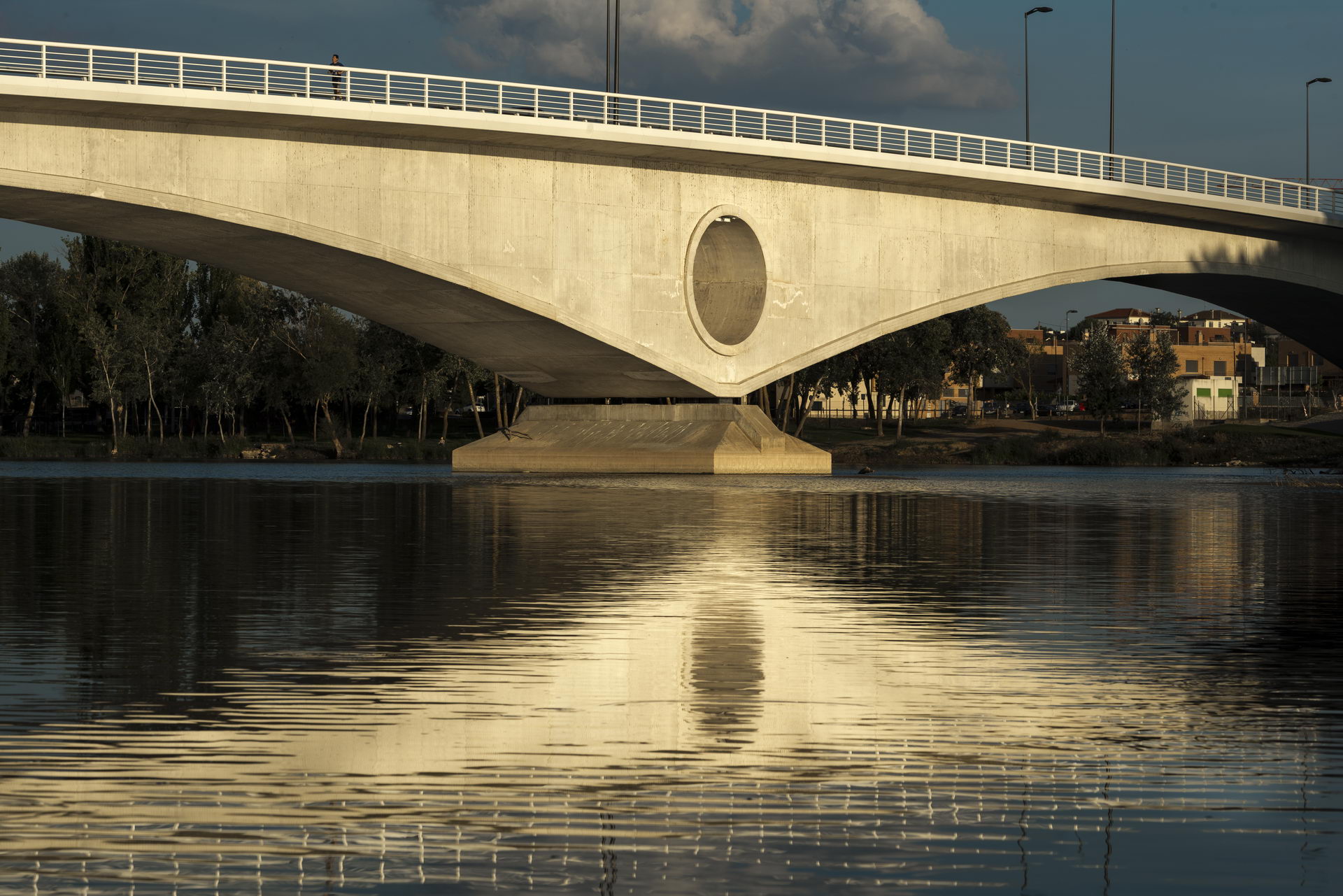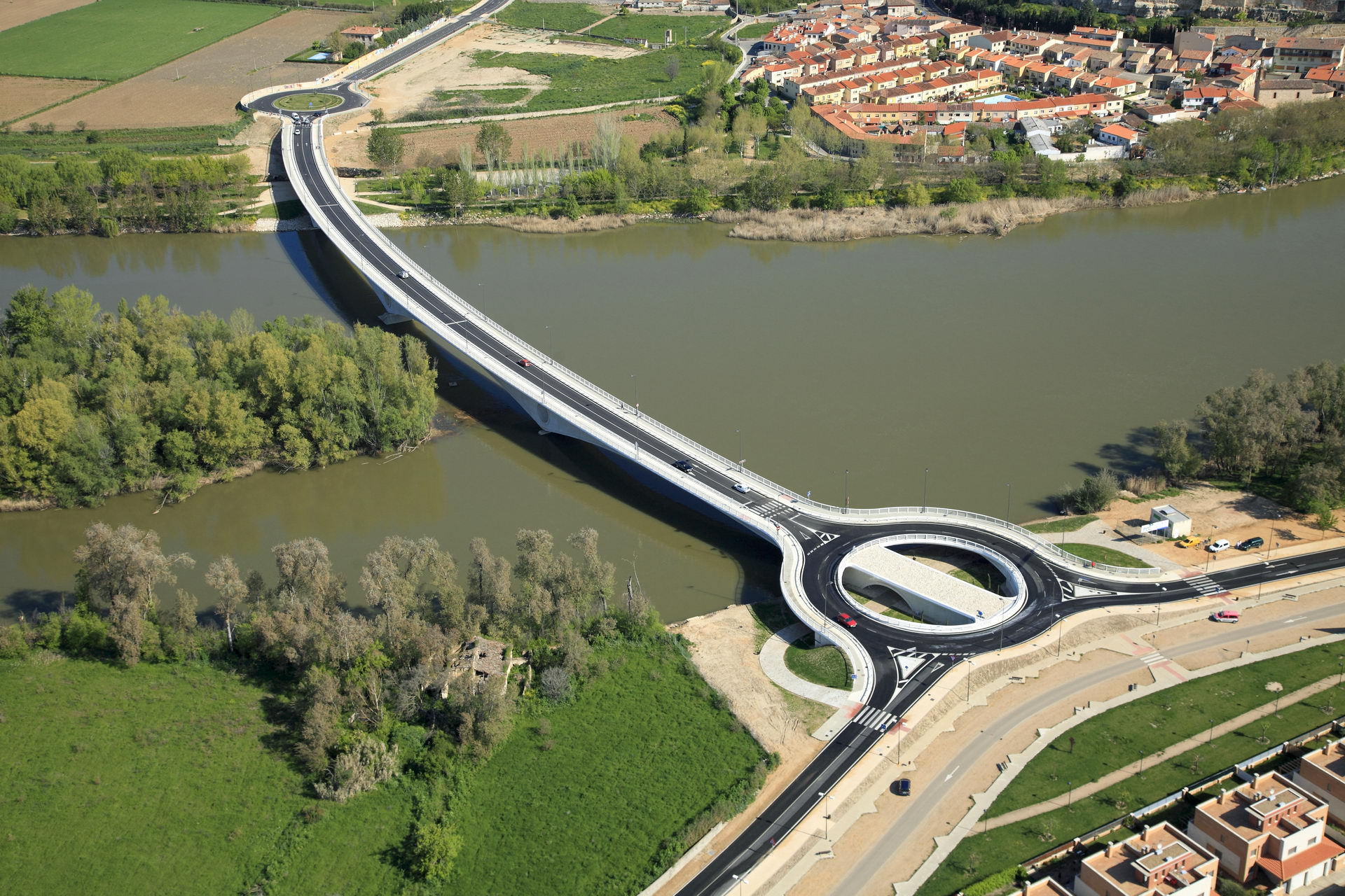 Otro aspecto destacable de la obra es la forma de resolver la conexión con los viales de la margen izquierda que debe realizarse en una rotonda justo en el borde del río. Con el fin de evitar una solución masiva y obstructiva sobre terraplenes o muros, la rotonda se materializa parcialmente con dos estructuras circulares conectados al puente principal, creando por debajo un espacio atractivo que es atravesado por el paseo de ribera.