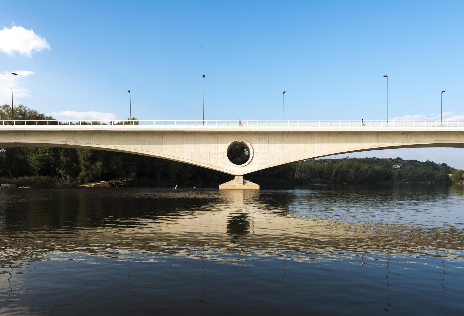 Con el objetivo de proporcionar un aspecto más cuidado a la obra y ponerla en relación con las formas del puente medieval, se ha modificado la disposición ortodoxa habitualmente empleada en puentes en sección de cajón como éste de dos formas. Por un lado el canto sobre apoyos se ha aumentado dramáticamente a 9 m (1/10L) –de hecho buscando eliminar la pilas para realizar un apoyo sobre un zócalo que sobresale ligeramente del agua- para así conseguir el aspecto de una arcada continua. Por otro lado se han creado unas grandes aperturas circulares en las secciones sobre apoyo que aligeran visualmente los alzados y que ponen a la nueva obra en relación con el puente de piedra y sus arquillos de descarga.