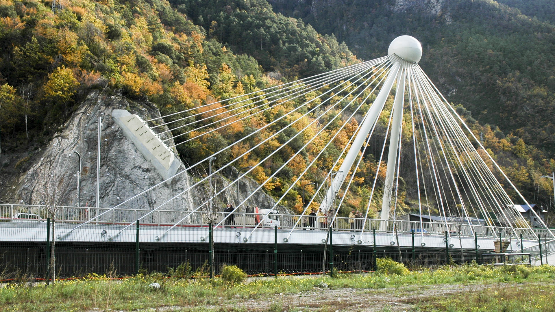 Los tirantes de compensación de la estructura están formados por barras ancladas en un extremo en la esfera, y en el otro extremo en la ladera de roca contigua al puente, en la margen izquierda del río.