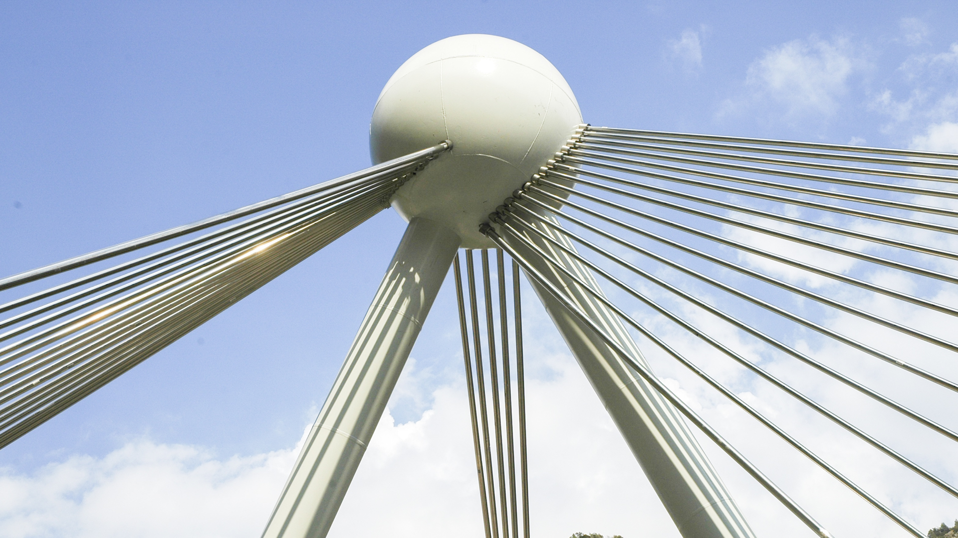 La estructura superior está formada por una esfera de 4 m. de diámetro donde se anclan los tirantes que soportan el tablero y los tirantes de compensación, que se anclan en su otro extremo a la roca.