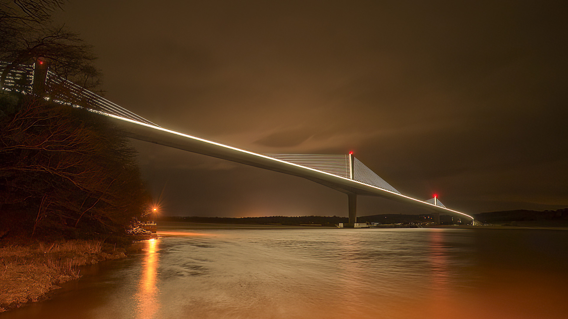 Los tirantes, de gran sección, son paralelos, están agrupados en un único plano central y pasan a través de las torres mediante sillas.