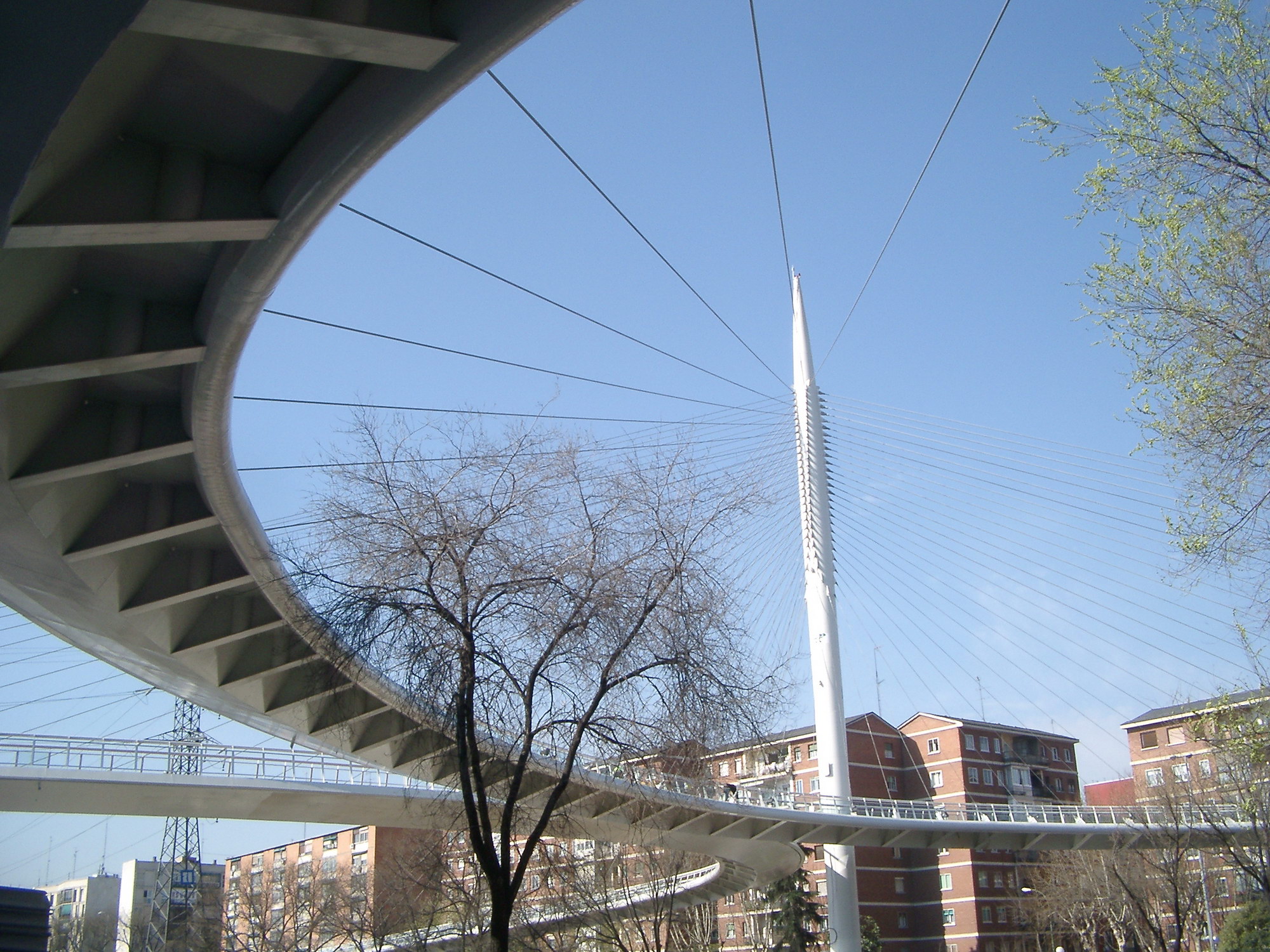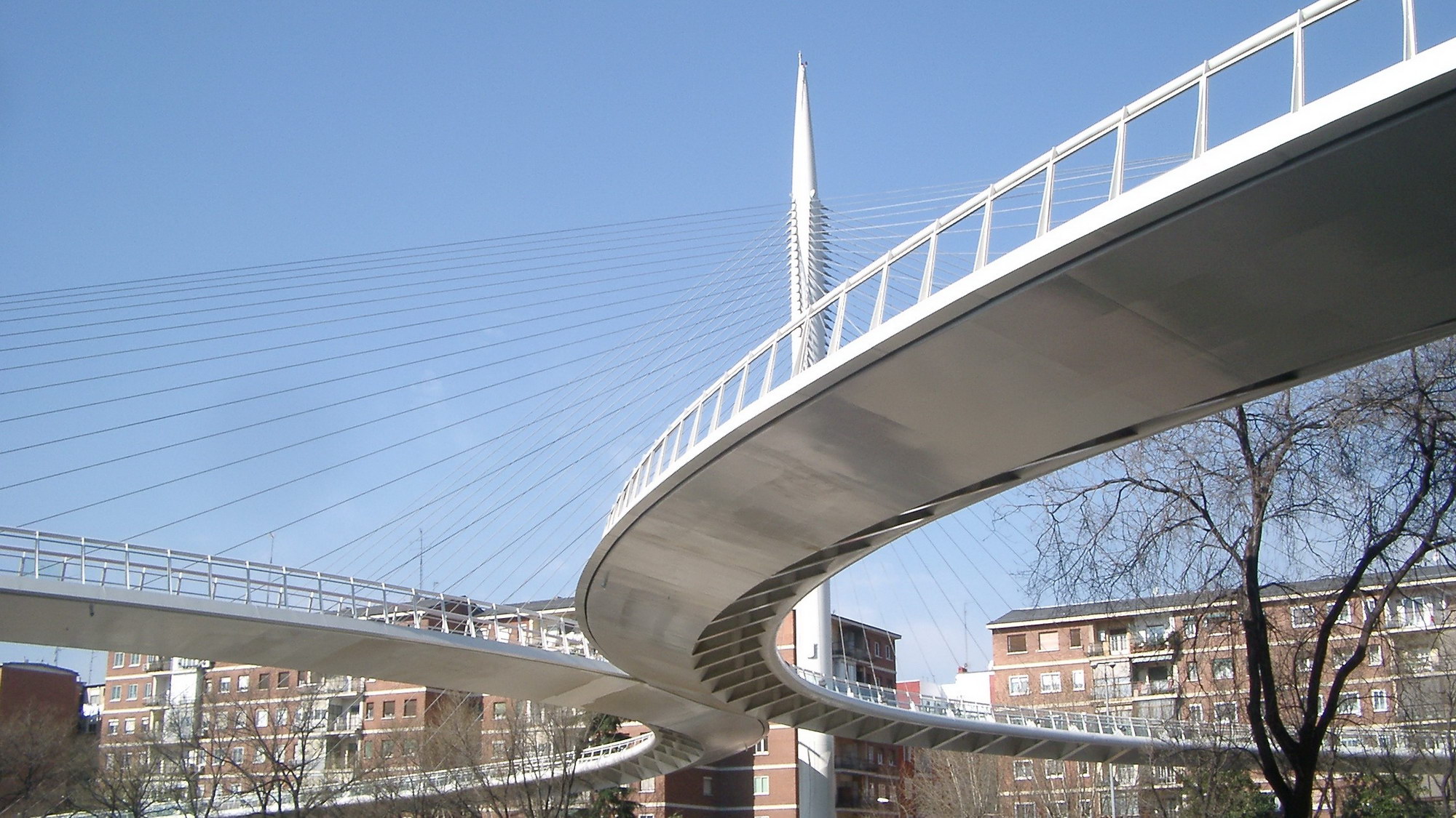 Se trata de una pasarela dividida en dos tramos circulares de 147 m de luz, que se desarrollan para salvar el río Manzanares y las dos autopistas que lo bordean.