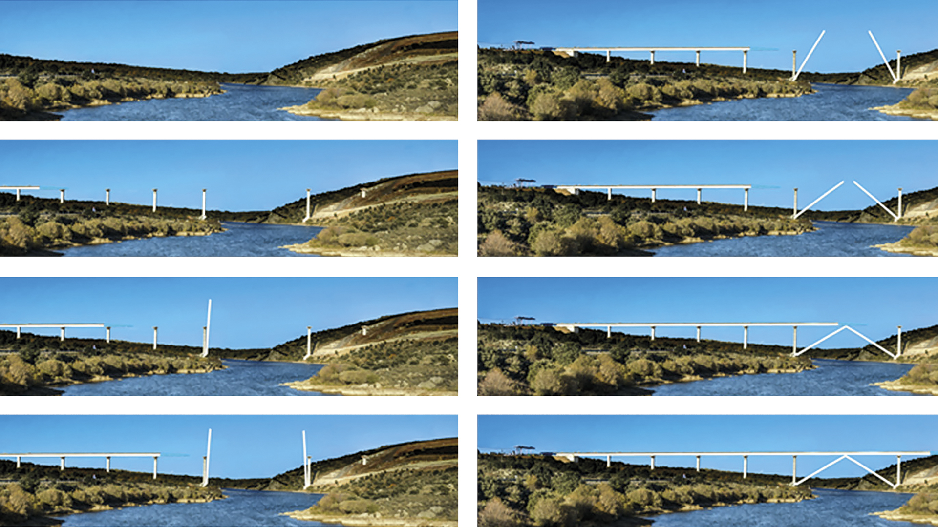 No hay problemas de tiro en ningún apoyo de las pilas, pero en los estribos se abren ligeramente para evitarlos, lo que implica la realización de una riostra en segunda fase en ambos estribos.
