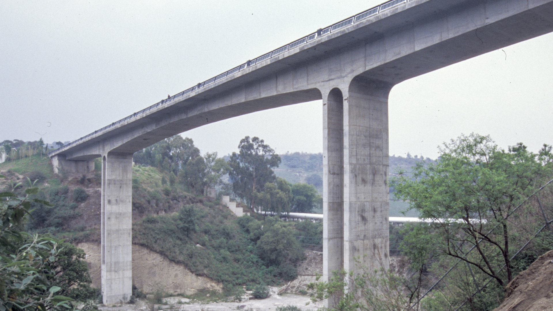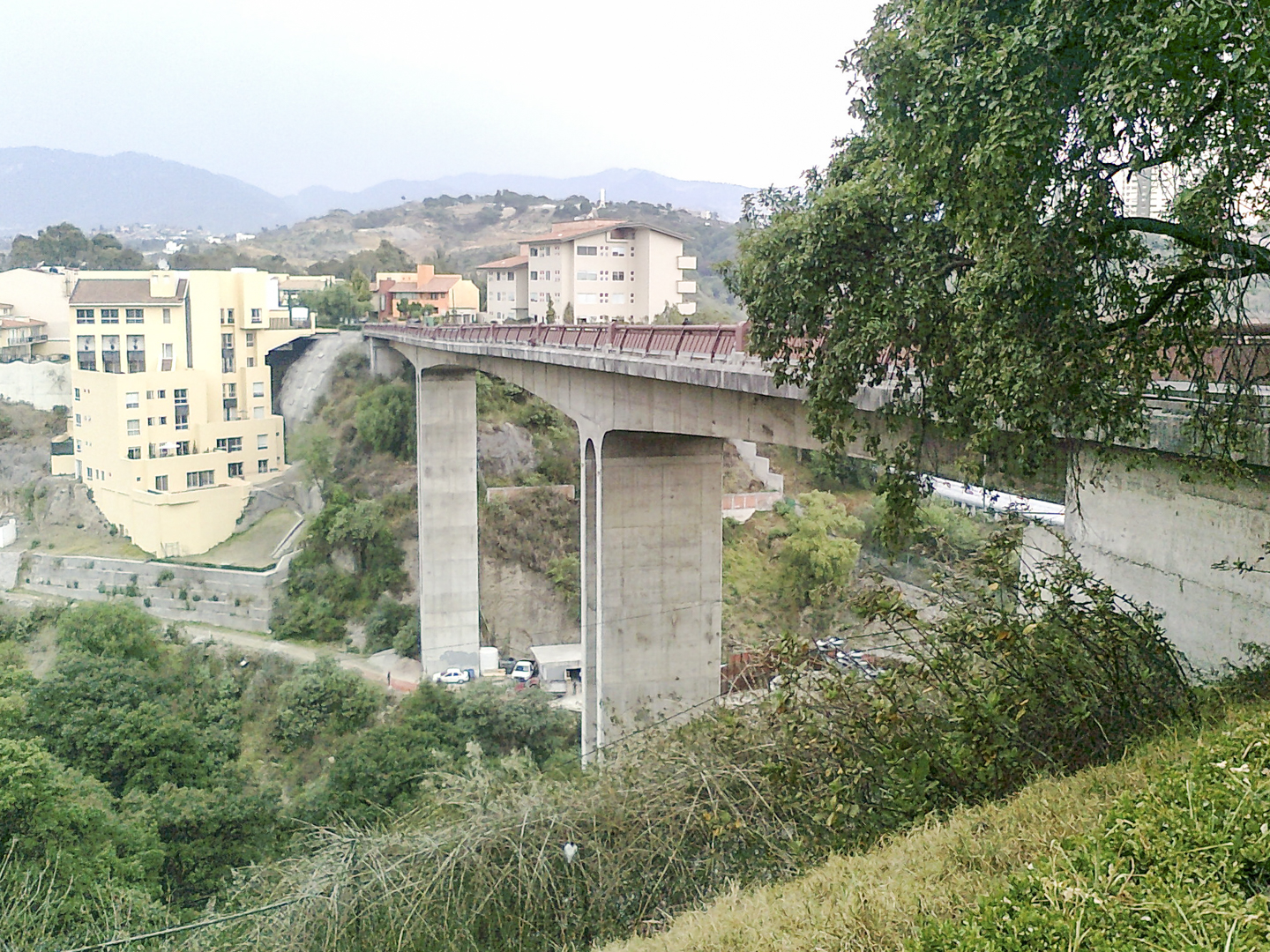 El puente del Lomas Country en la ciudad de México cruza un valle en V con 160 metros de longitud y una altura libre sobre el fondo de 60 metros. Se ha proyectado con tres vanos de 40+80+40 metros de luz, y debía ser lo más económico posible, porque debía sustituir a una solución de vigas que tenía problemas de cimentación.