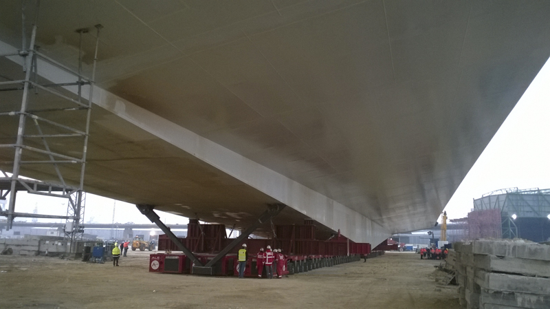 El pasado martes día 27 de enero por la noche se terminó la operación de montaje del tramo metálico de 150 m de luz en el Puente sobre la Bahía de Cadiz. Este hecho es la culminación de un conjunto de operaciones iniciadas a principios del mes de enero de gran complejidad técnica y donde se ha puesto de manifiesto el gran nivel de la ingeniería de la construcción en España, motivado por las dimensiones del tablero y su peso de 4100 T.